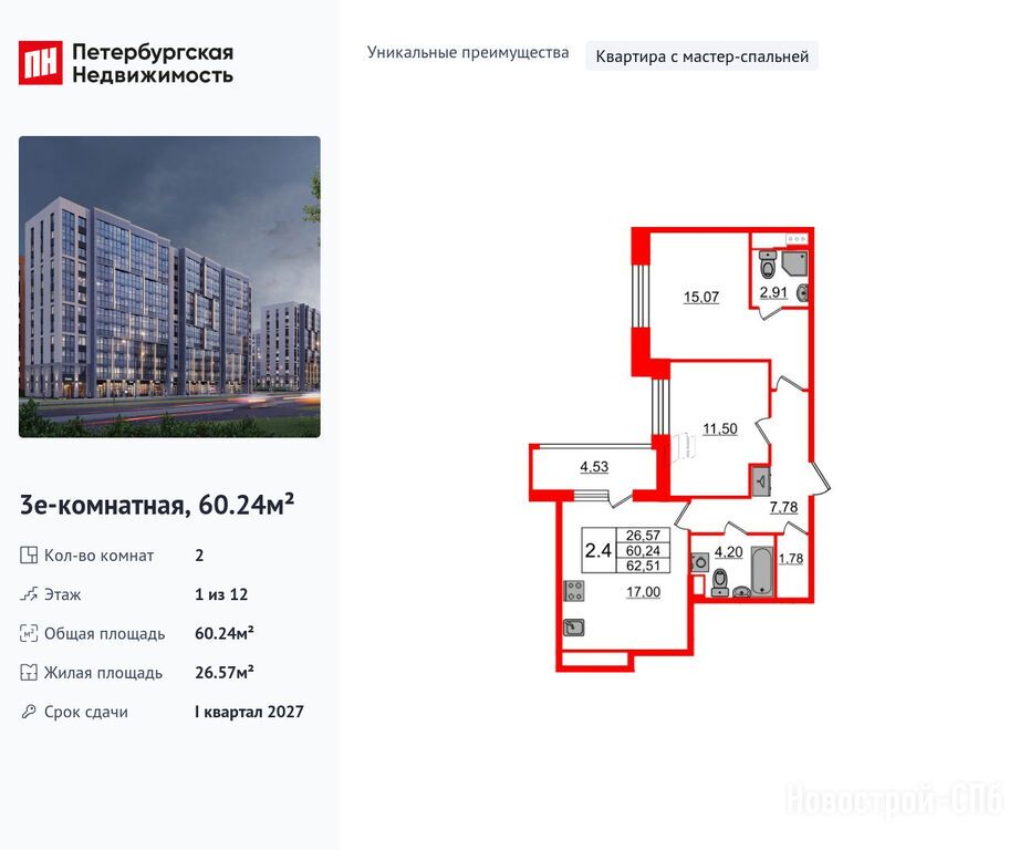 Продается двухкомнатная квартира в новостройке ЖК «Бионика Заповедная» по адресу Санкт-Петербург, Приморский, Орлово-Денисовский проспект, 16к2. Общая площадь квартиры - 60.24 кв. м. Тип проекта, по которому построен дом — Монолит, компания-застройщик — Setl Group (Сэтл Групп), ООО СЗ СЭТЛ РАЗВИТИЕ. Стоимость квартиры — 16 600 337 руб. Способы оплаты можно уточнить у продавца. Срок сдачи — 1 квартал 2027. Более подробная информация по телефону.