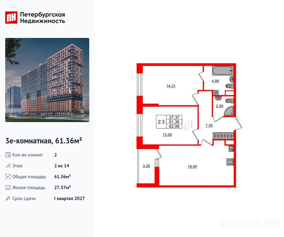Продается двухкомнатная квартира в новостройке ЖК «Город звёзд» по адресу Ленинградская область, Всеволожский район, Поселок им. Свердлова, Новосаратовка дер., ЖК «Город звезд», корпус 5.1. Общая площадь квартиры - 61.36 кв. м. Тип проекта, по которому построен дом — Монолитно-кирпичный, компания-застройщик — Setl Group (Сэтл Групп). Стоимость квартиры — 10 350 254 руб. Способы оплаты можно уточнить у продавца. Срок сдачи — 1 квартал 2027. Более подробная информация по телефону.
