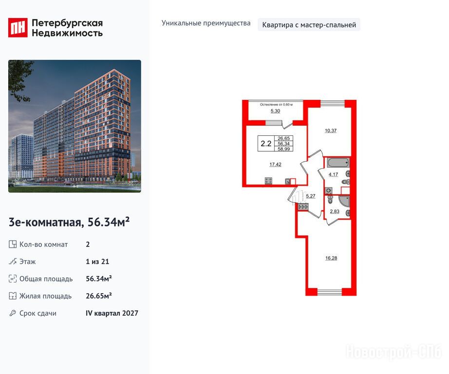 Продается двухкомнатная квартира в новостройке ЖК «Город звёзд» по адресу Ленинградская область, Всеволожский район, Поселок им. Свердлова, Новосаратовка дер., ЖК «Город звезд», корпус 8. Общая площадь квартиры - 56.34 кв. м. Тип проекта, по которому построен дом — Монолитно-кирпичный, компания-застройщик — Setl Group (Сэтл Групп). Стоимость квартиры — 9 300 044 руб. Способы оплаты можно уточнить у продавца. Срок сдачи — 4 квартал 2027. Более подробная информация по телефону.