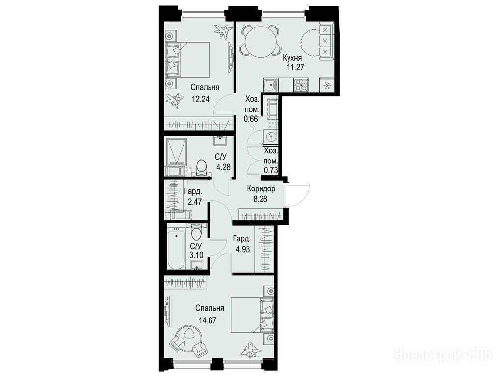 Разнообразие отличное, а количество квартир на каждом этаже небольшое, так что квартал не станет перегруженным. Помещения общего пользования, представленные на презентации, выглядят очень стильно и дорого.