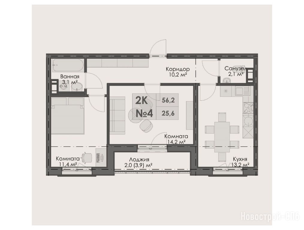 2-комн. квартира, 56.20 м2, 2 этаж