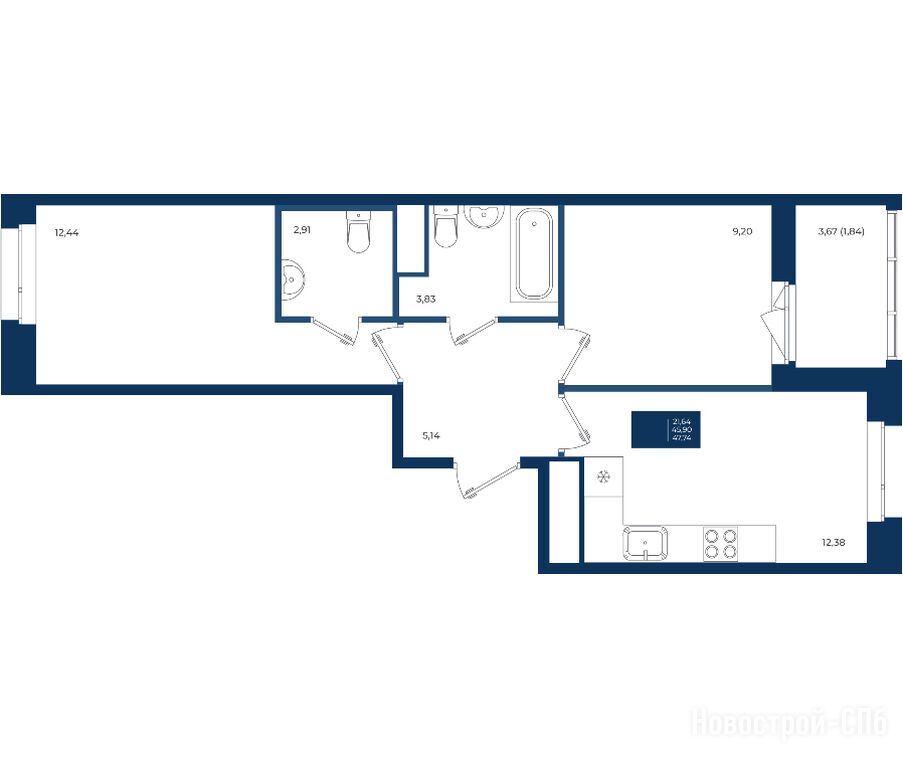 2-комн. квартира, 47.74 м2, 7 этаж