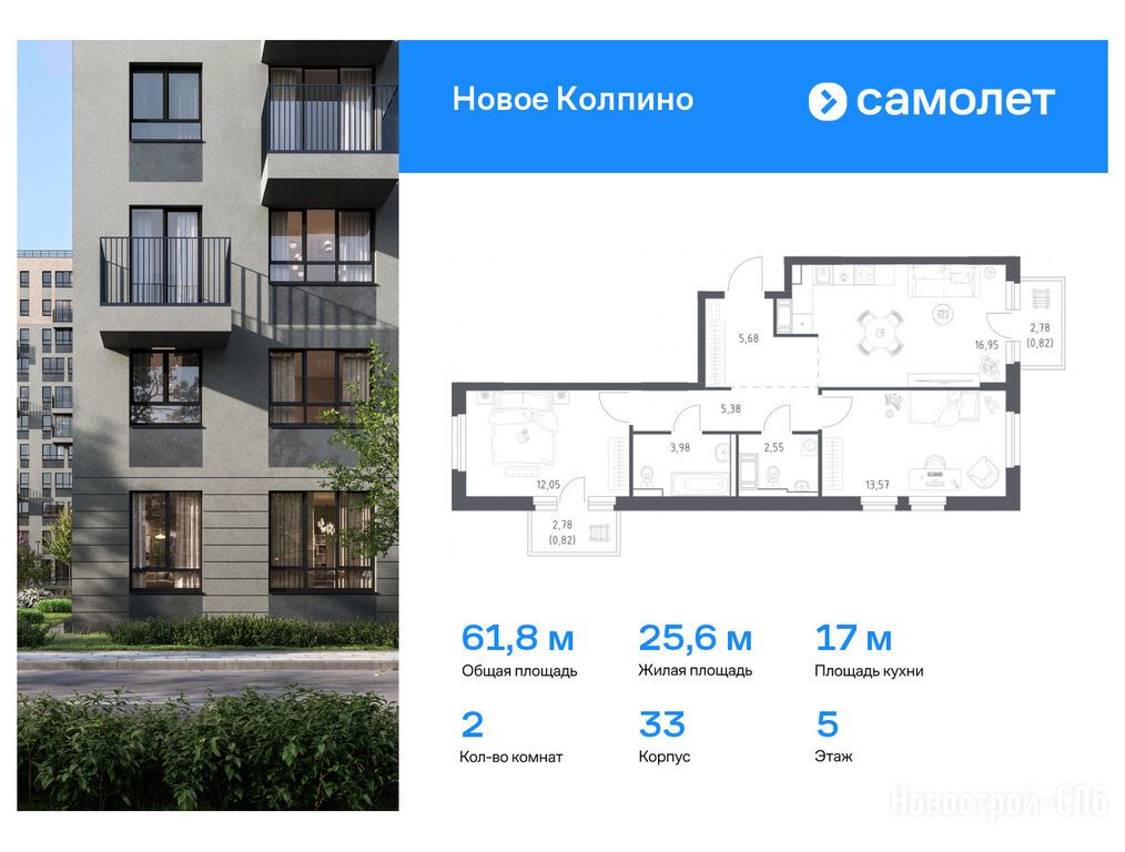 Продается двухкомнатная квартира в новостройке ЖК «Новое Колпино» по адресу Санкт-Петербург, Колпинский, Колпино, ЖК «Новое Колпино», корп. 33. Общая площадь квартиры - 61.8 кв. м. Тип проекта, по которому построен дом — Монолитно-кирпичный, компания-застройщик — ООО «СПб Реновация», Самолет. Стоимость квартиры — 11 597 388 руб. Способы оплаты можно уточнить у продавца. Срок сдачи — 1 квартал 2026. Более подробная информация по телефону.