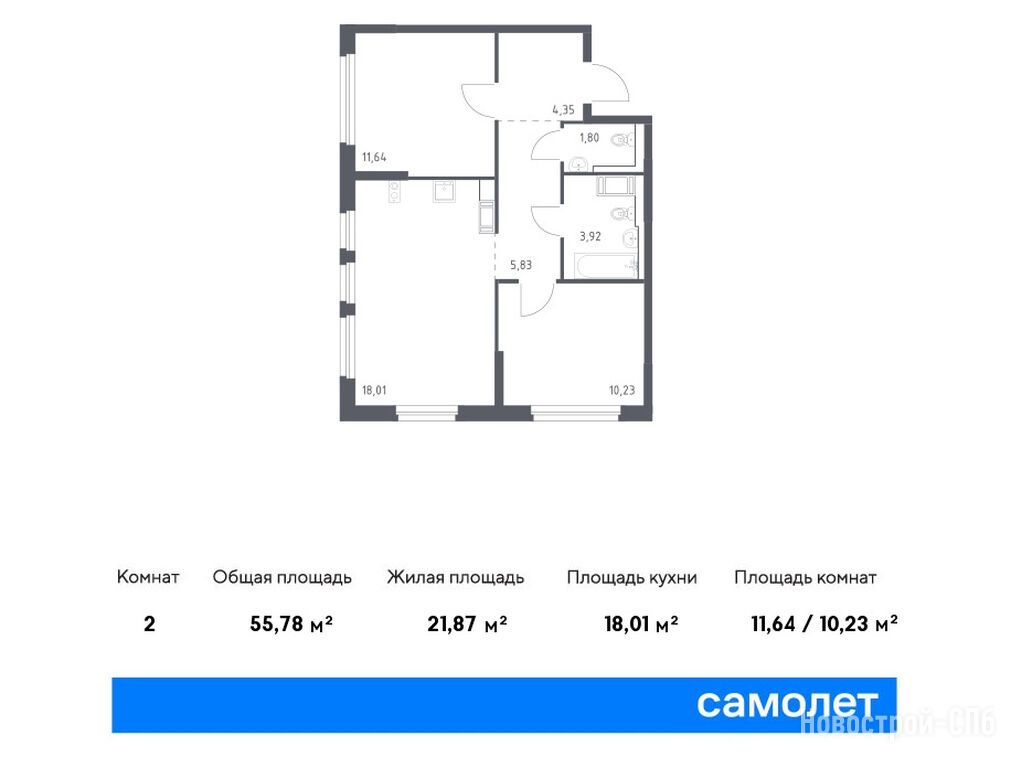 Продается двухкомнатная квартира в новостройке ЖК «Новое Колпино» по адресу Санкт-Петербург, Колпинский, Колпино, ЖК «Новое Колпино», корп. 33. Общая площадь квартиры - 55.78 кв. м. Тип проекта, по которому построен дом — Монолитно-кирпичный, компания-застройщик — ООО «СПб Реновация», Самолет. Стоимость квартиры — 10 624 919 руб. Способы оплаты можно уточнить у продавца. Срок сдачи — 1 квартал 2026. Более подробная информация по телефону.