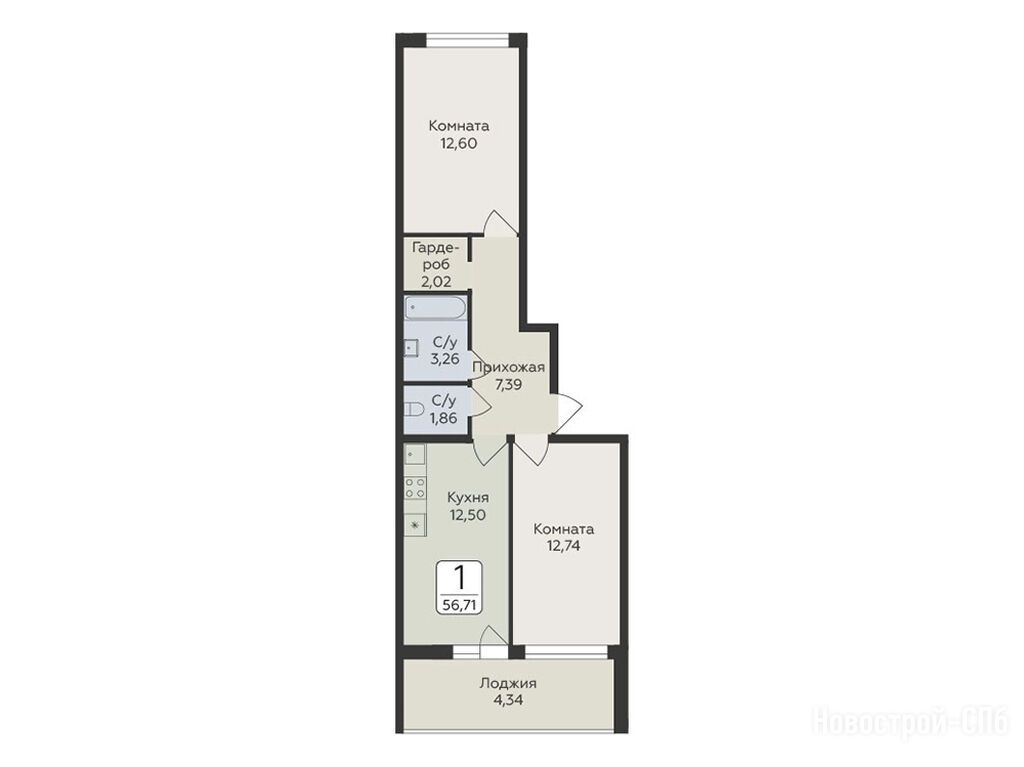 2-комн. квартира, 56.71 м2, 1 этаж