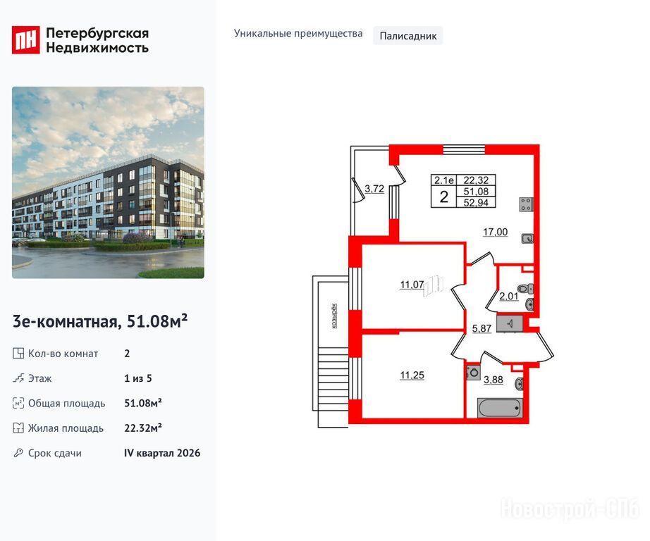 Продается двухкомнатная квартира в новостройке ЖК «Парадный ансамбль» по адресу Санкт-Петербург, Московский, Пулковское шоссе 103Х. Общая площадь квартиры - 51.08 кв. м. Тип проекта, по которому построен дом — Монолитно-кирпичный, компания-застройщик — Setl Group (Сэтл Групп). Стоимость квартиры — 13 700 116 руб. Способы оплаты можно уточнить у продавца. Срок сдачи — 1 квартал 2028. Более подробная информация по телефону.