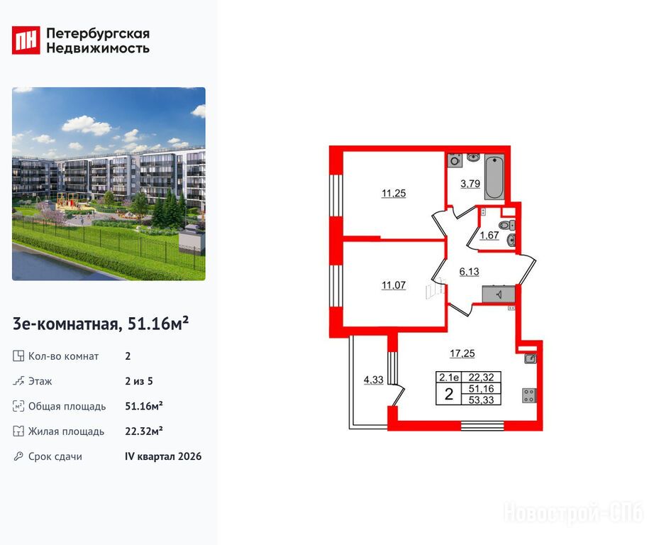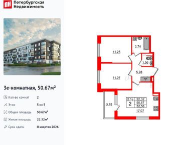 Продается двухкомнатная квартира в новостройке ЖК «Парадный ансамбль» по адресу Санкт-Петербург, Московский, Пулковское шоссе 103Х, корпус 7.13. Общая площадь квартиры - 51.16 кв. м. Тип проекта, по которому построен дом — Монолитно-кирпичный, компания-застройщик — Setl Group (Сэтл Групп). Стоимость квартиры — 13 750 273 руб. Способы оплаты можно уточнить у продавца. Срок сдачи — 4 квартал 2026. Более подробная информация по телефону.
