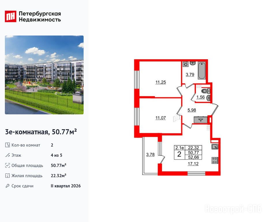 Продается двухкомнатная квартира в новостройке ЖК «Парадный ансамбль» по адресу Санкт-Петербург, Московский, Пулковское шоссе, участок 29, корпус 6.5. Общая площадь квартиры - 50.77 кв. м. Тип проекта, по которому построен дом — Монолитно-кирпичный, компания-застройщик — Setl Group (Сэтл Групп). Стоимость квартиры — 12 700 326 руб. Способы оплаты можно уточнить у продавца. Срок сдачи — 2 квартал 2026. Более подробная информация по телефону.