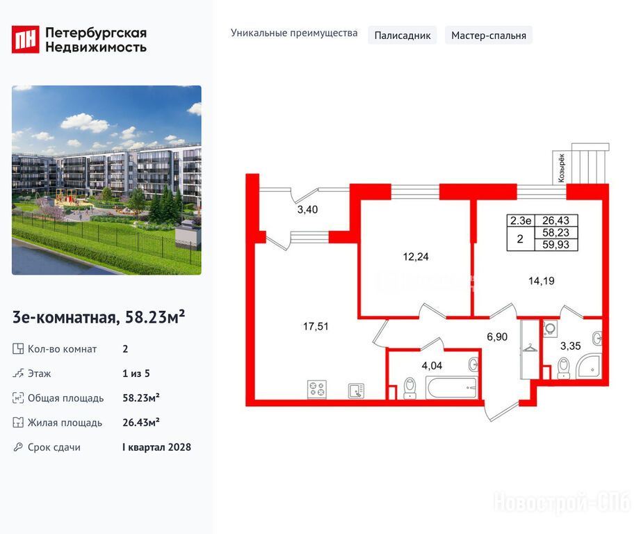 Продается двухкомнатная квартира в новостройке ЖК «Парадный ансамбль» по адресу Санкт-Петербург, Московский, Пулковское шоссе 103Х. Общая площадь квартиры - 58.23 кв. м. Тип проекта, по которому построен дом — Монолитно-кирпичный, компания-застройщик — Setl Group (Сэтл Групп). Стоимость квартиры — 14 050 288 руб. Способы оплаты можно уточнить у продавца. Срок сдачи — 1 квартал 2028. Более подробная информация по телефону.