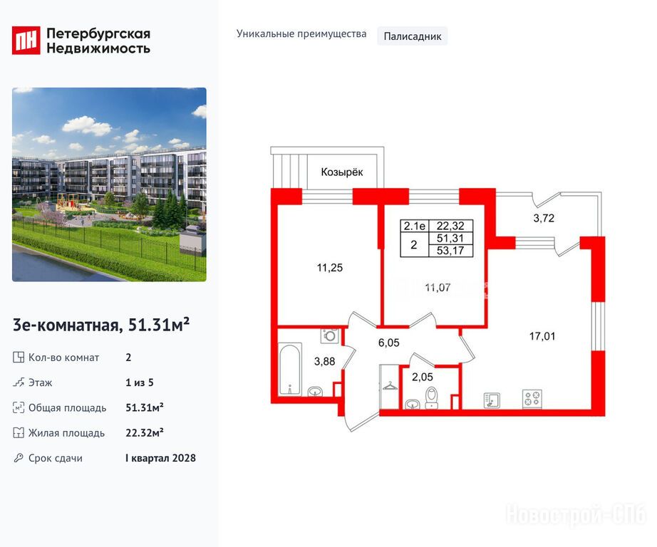 Продается двухкомнатная квартира в новостройке ЖК «Парадный ансамбль» по адресу Санкт-Петербург, Московский, Пулковское шоссе 103Х. Общая площадь квартиры - 51.31 кв. м. Тип проекта, по которому построен дом — Монолитно-кирпичный, компания-застройщик — Setl Group (Сэтл Групп). Стоимость квартиры — 12 550 221 руб. Способы оплаты можно уточнить у продавца. Срок сдачи — 1 квартал 2028. Более подробная информация по телефону.