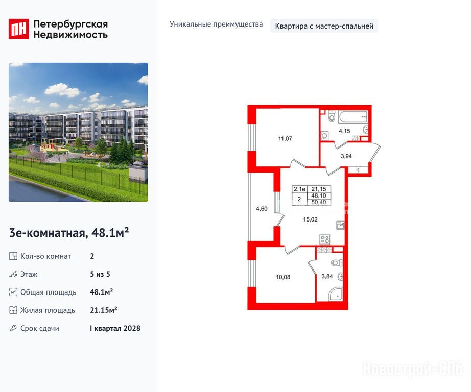 Продается двухкомнатная квартира в новостройке ЖК «Парадный ансамбль» по адресу Санкт-Петербург, Московский, Пулковское шоссе 103Х. Общая площадь квартиры - 48.1 кв. м. Тип проекта, по которому построен дом — Монолитно-кирпичный, компания-застройщик — Setl Group (Сэтл Групп). Стоимость квартиры — 13 500 227 руб. Способы оплаты можно уточнить у продавца. Срок сдачи — 1 квартал 2028. Более подробная информация по телефону.