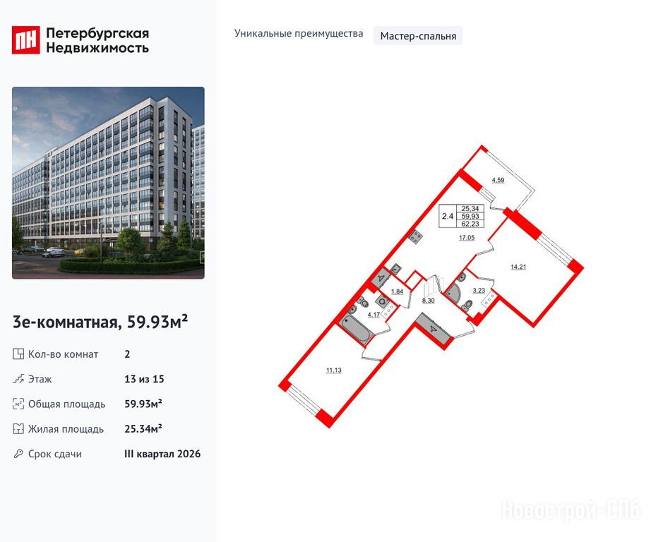 Продается двухкомнатная квартира в новостройке ЖК «Пульс Премьер» по адресу Санкт-Петербург, Невский, Октябрьская набережная. Общая площадь квартиры - 59.93 кв. м. Тип проекта, по которому построен дом — Монолитно-кирпичный, компания-застройщик — Setl Group (Сэтл Групп). Стоимость квартиры — 22 150 458 руб. Способы оплаты можно уточнить у продавца. Срок сдачи — 3 квартал 2026. Более подробная информация по телефону.