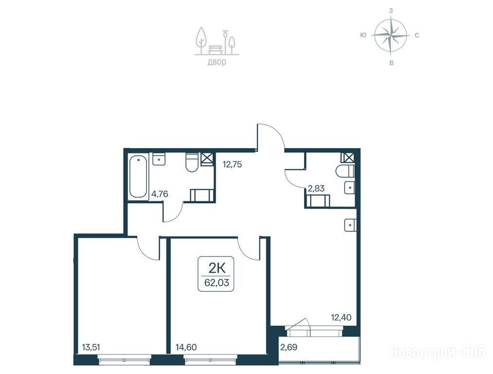 2-комн. квартира, 62.03 м2, 4 этаж
