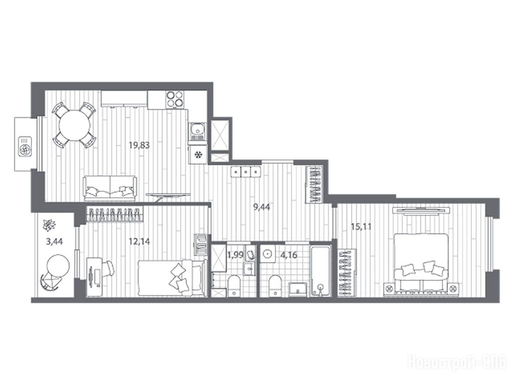 Забронировали трехкомнатную квартиру со светлой отделкой. Два сан узла, балкон, кухня-гостиная почти 19,м2. Понравилась идея с общественными террасами. Там посадят кустарники, обустроят лаунж-зоны, поставят столики, стулья. Можно будет и погулять и поработать
