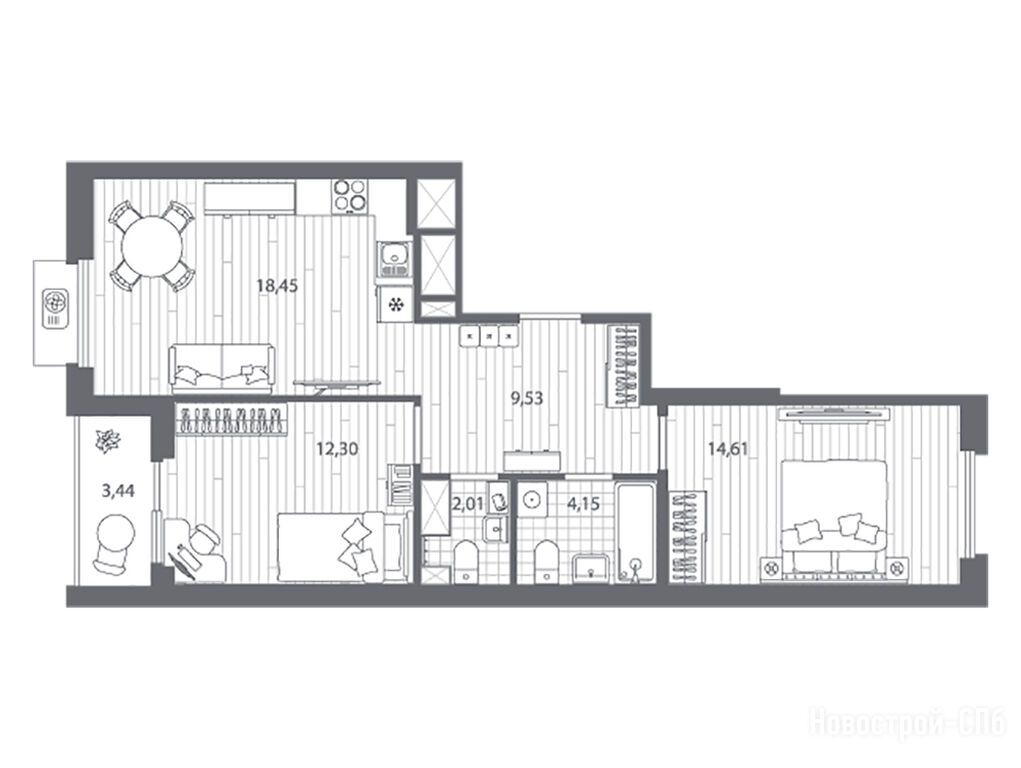 Забронировали трехкомнатную квартиру со светлой отделкой. Два сан узла, балкон, кухня-гостиная почти 19,м2. Понравилась идея с общественными террасами. Там посадят кустарники, обустроят лаунж-зоны, поставят столики, стулья. Можно будет и погулять и поработать