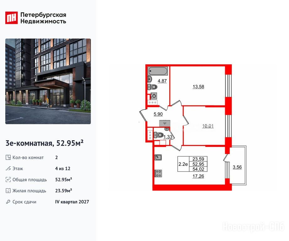 Продается двухкомнатная квартира в новостройке ЖК Setl Лофт по адресу Санкт-Петербург, Московский, ул. Георгия Чернышёва. Общая площадь квартиры - 52.95 кв. м. Тип проекта, по которому построен дом — Монолитно-кирпичный, компания-застройщик — Setl Group (Сэтл Групп), СЗ «Сэтл Московское шоссе». Стоимость квартиры — 18 550 291 руб. Способы оплаты можно уточнить у продавца. Срок сдачи — 4 квартал 2027. Более подробная информация по телефону.