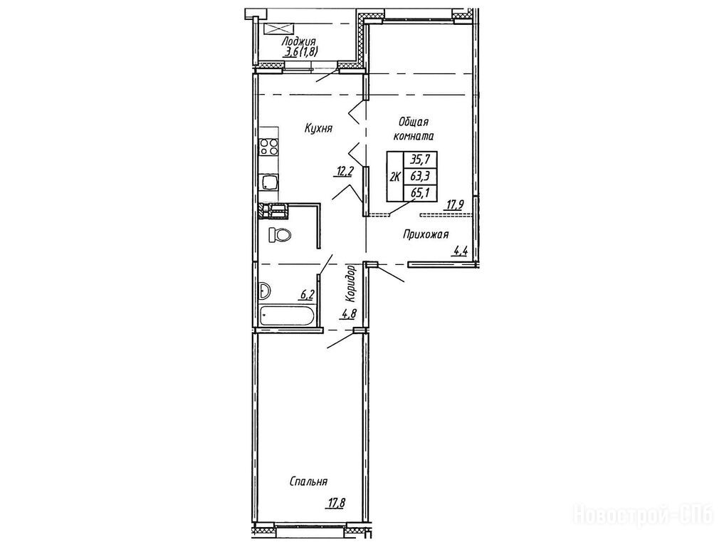 2-комн. квартира, 65.10 м2, 2 этаж