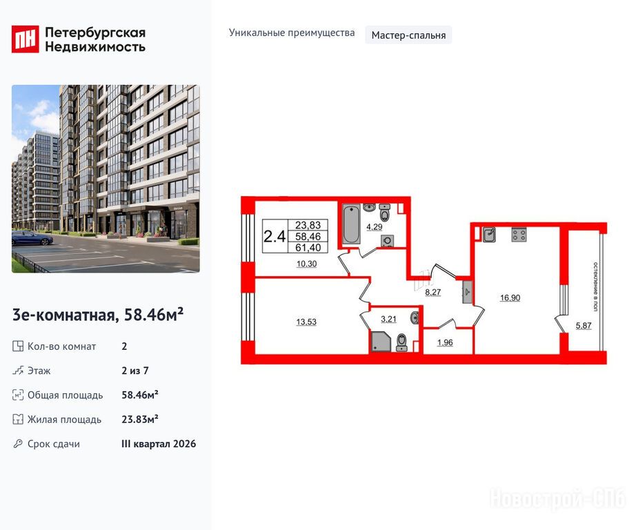Продается двухкомнатная квартира в новостройке ЖК «Титул в Московском» по адресу Санкт-Петербург, Московский, ул. Кубинская, ЖК «Титул в Московском», корпус 1.1. Общая площадь квартиры - 58.46 кв. м. Тип проекта, по которому построен дом — Монолитно-кирпичный, компания-застройщик — Setl Group (Сэтл Групп), ООО «Новый элемент». Стоимость квартиры — 21 300 047 руб. Способы оплаты можно уточнить у продавца. Срок сдачи — 3 квартал 2026. Более подробная информация по телефону.