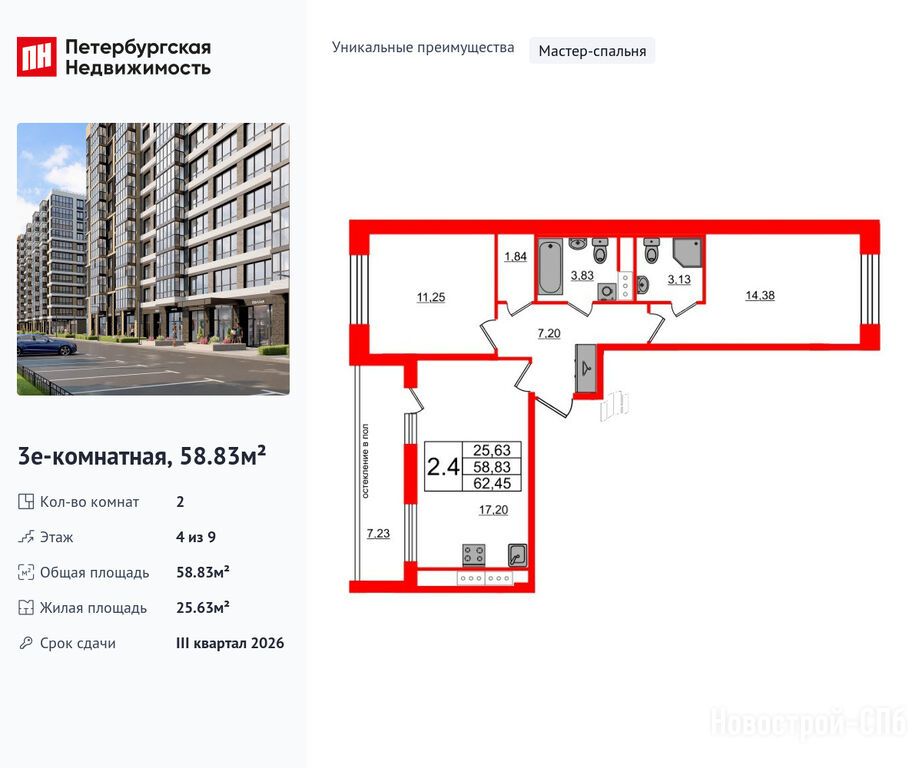 Продается двухкомнатная квартира в новостройке ЖК «Титул в Московском» по адресу Санкт-Петербург, Московский, ул. Кубинская, ЖК «Титул в Московском», корпус 2. Общая площадь квартиры - 58.83 кв. м. Тип проекта, по которому построен дом — Монолитно-кирпичный, компания-застройщик — Setl Group (Сэтл Групп), ООО «Новый элемент». Стоимость квартиры — 20 700 277 руб. Способы оплаты можно уточнить у продавца. Срок сдачи — 4 квартал 2028. Более подробная информация по телефону.