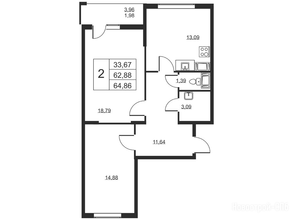 2-комн. квартира, 64.86 м2, 16 этаж