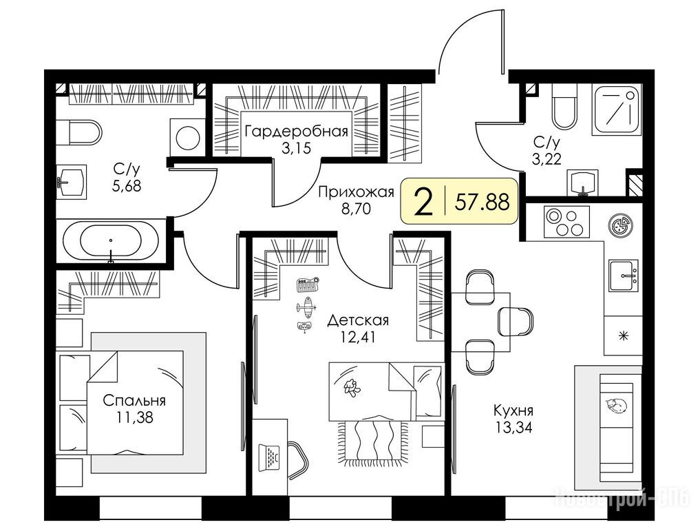 2-комн. квартира, 57.88 м2, 2 этаж