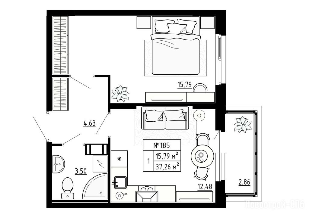 1-комн. квартира, 37.26 м2, 2 этаж