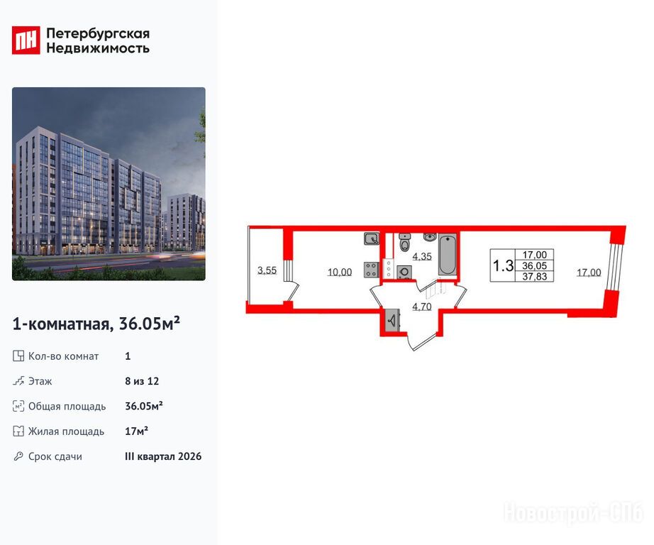 Продается однокомнатная квартира в новостройке ЖК «Бионика Заповедная» по адресу Санкт-Петербург, Приморский, Суздальское шоссе, ЖК «Бионика Заповедная», корпус 1.4. Общая площадь квартиры - 36.05 кв. м. Тип проекта, по которому построен дом — Монолит, компания-застройщик — Setl Group (Сэтл Групп), ООО СЗ СЭТЛ РАЗВИТИЕ. Стоимость квартиры — 10 150 083 руб. Способы оплаты можно уточнить у продавца. Срок сдачи — 3 квартал 2026. Более подробная информация по телефону.