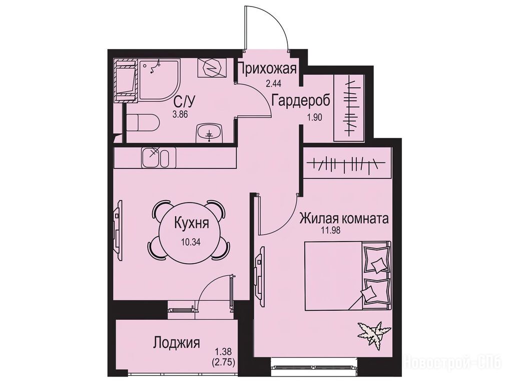 1-комн. квартира, 31.90 м2, 2 этаж