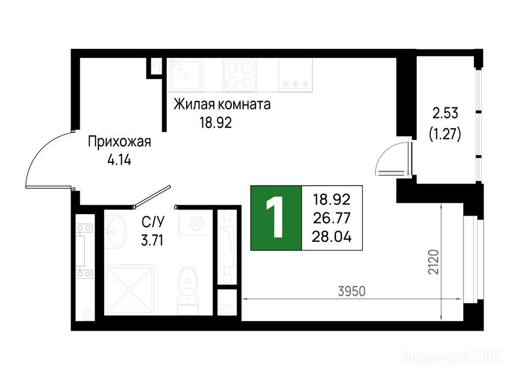1-комн. квартира, 28.04 м2, 12 этаж