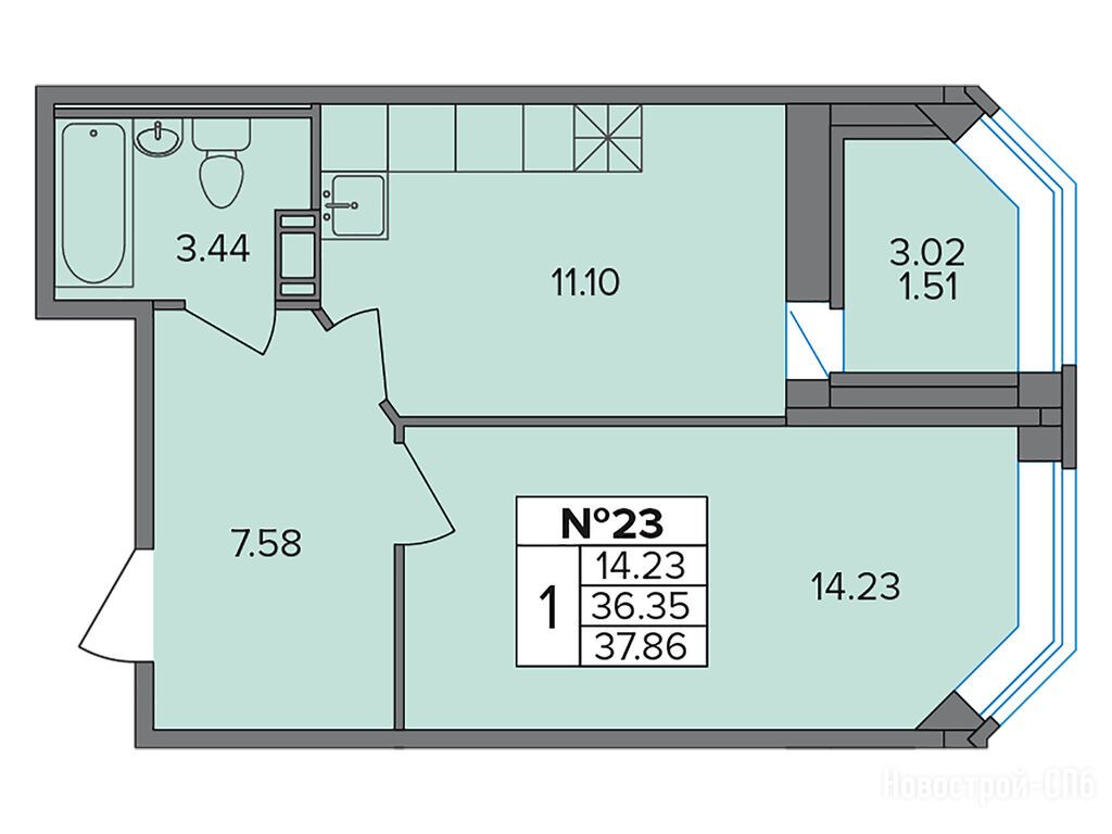 1-комн. квартира, 37.86 м2, 2 этаж