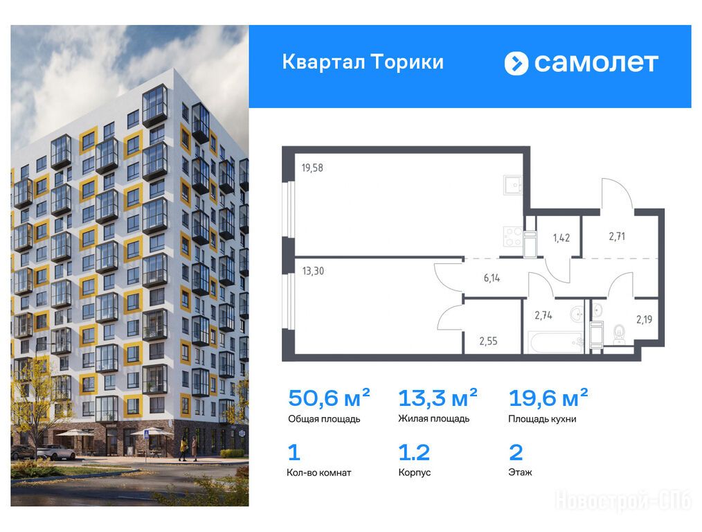 Продается однокомнатная квартира в новостройке ЖК «Квартал Торики» по адресу Ленинградская область, Ломоносовский район, Виллозское г.п., пос. Новогорелово. Общая площадь квартиры - 50.63 кв. м. Тип проекта, по которому построен дом — Монолитно-кирпичный, компания-застройщик — Самолет. Стоимость квартиры — 8 800 861 руб. Способы оплаты можно уточнить у продавца. Срок сдачи — 2 квартал 2026. Более подробная информация по телефону.