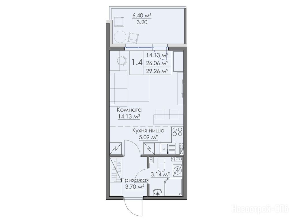 1-комн. квартира, 29.26 м2, 3 этаж