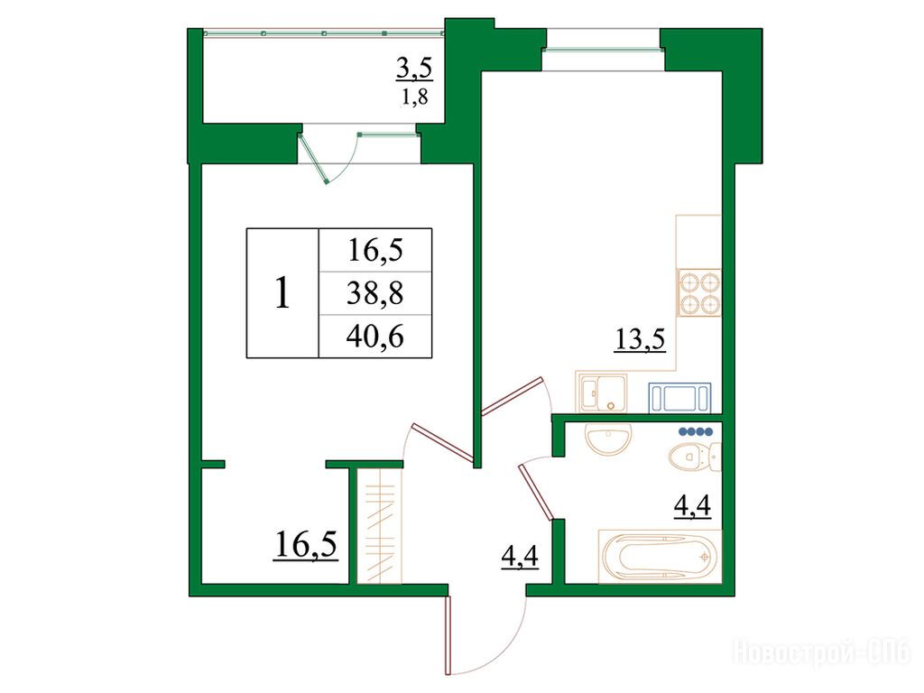 1-комн. квартира, 40.60 м2, 4 этаж
