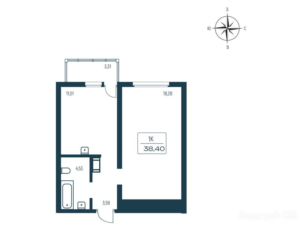 1-комн. квартира, 38.20 м2, 11 этаж