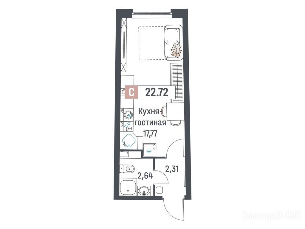 студия, 22.72 м2, 2 этаж