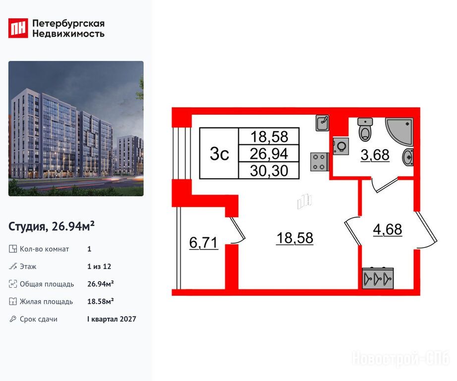 Продается студия в новостройке ЖК «Бионика Заповедная» по адресу Санкт-Петербург, Приморский, Орлово-Денисовский проспект, 20к2. Общая площадь квартиры - 26.94 кв. м. Тип проекта, по которому построен дом — Монолит, компания-застройщик — Setl Group (Сэтл Групп), ООО СЗ СЭТЛ РАЗВИТИЕ. Стоимость квартиры — 6 800 087 руб. Способы оплаты можно уточнить у продавца. Срок сдачи — 1 квартал 2027. Более подробная информация по телефону.