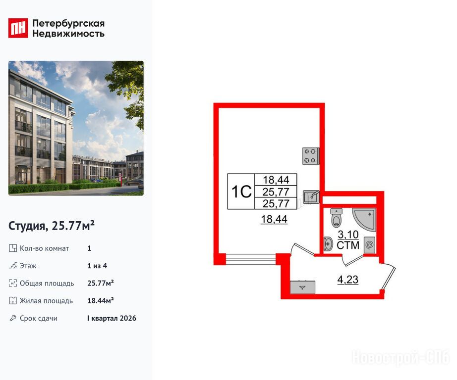 Продается студия в новостройке ЖК «Дворцовый фасад» по адресу Санкт-Петербург, Петродворцовый, Стрельна пос., проспект Будённого, 18к4. Общая площадь квартиры - 25.77 кв. м. Тип проекта, по которому построен дом — Монолитно-кирпичный, компания-застройщик — Setl Group (Сэтл Групп). Стоимость квартиры — 6 550 103 руб. Способы оплаты можно уточнить у продавца. Срок сдачи — 1 квартал 2026. Более подробная информация по телефону.