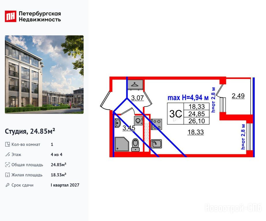Продается студия в новостройке ЖК «Дворцовый фасад» по адресу Санкт-Петербург, Петродворцовый, Стрельна пос., пр-т. Буденного, уч. 16. Общая площадь квартиры - 24.85 кв. м. Тип проекта, по которому построен дом — Монолитно-кирпичный, компания-застройщик — Setl Group (Сэтл Групп). Стоимость квартиры — 7 700 207 руб. Способы оплаты можно уточнить у продавца. Срок сдачи — 4 квартал 2026. Более подробная информация по телефону.