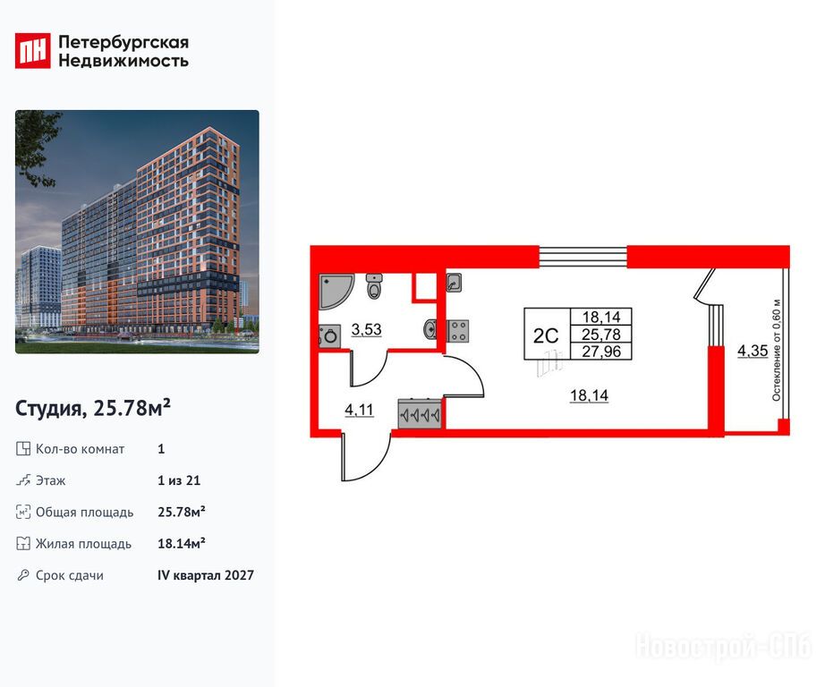 Продается студия в новостройке ЖК «Город звёзд» по адресу Ленинградская область, Всеволожский район, Поселок им. Свердлова, Новосаратовка дер., ул. Рабочая (корп.7). Общая площадь квартиры - 25.78 кв. м. Тип проекта, по которому построен дом — Монолитно-кирпичный, компания-застройщик — Setl Group (Сэтл Групп). Стоимость квартиры — 4 400 130 руб. Способы оплаты можно уточнить у продавца. Срок сдачи — 4 квартал 2027. Более подробная информация по телефону.