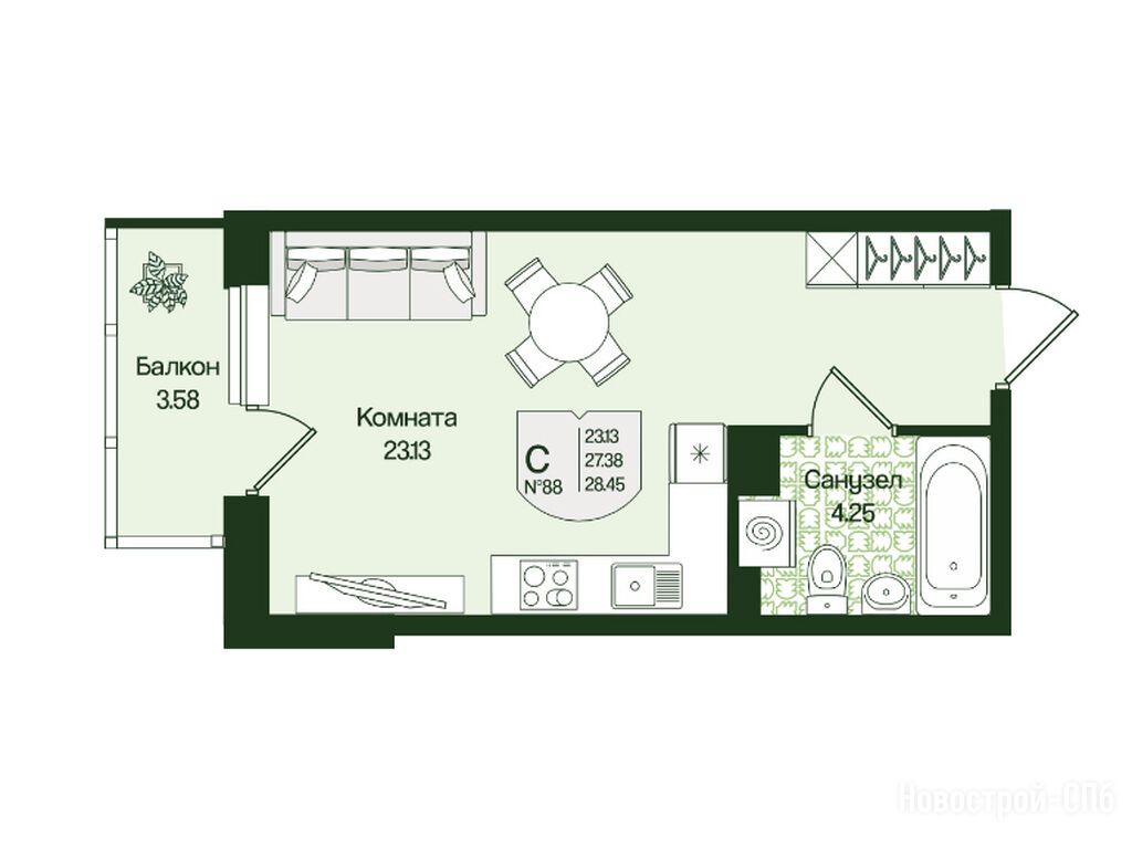 студия, 28.45 м2, 3 этаж