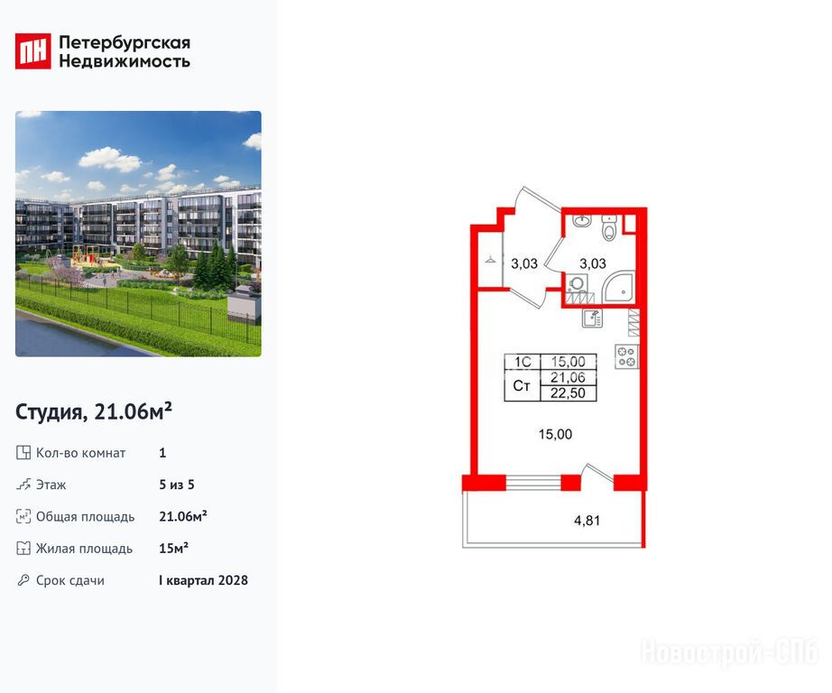 Продается студия в новостройке ЖК «Парадный ансамбль» по адресу Санкт-Петербург, Московский, Пулковское шоссе 103Х. Общая площадь квартиры - 21.06 кв. м. Тип проекта, по которому построен дом — Монолитно-кирпичный, компания-застройщик — Setl Group (Сэтл Групп). Стоимость квартиры — 5 650 093 руб. Способы оплаты можно уточнить у продавца. Срок сдачи — 1 квартал 2028. Более подробная информация по телефону.