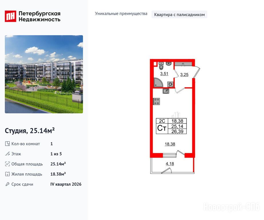 Продается студия в новостройке ЖК «Парадный ансамбль» по адресу Санкт-Петербург, Московский, Пулковское шоссе 103Х, корпус 7.13. Общая площадь квартиры - 25.14 кв. м. Тип проекта, по которому построен дом — Монолитно-кирпичный, компания-застройщик — Setl Group (Сэтл Групп). Стоимость квартиры — 5 800 188 руб. Способы оплаты можно уточнить у продавца. Срок сдачи — 4 квартал 2026. Более подробная информация по телефону.