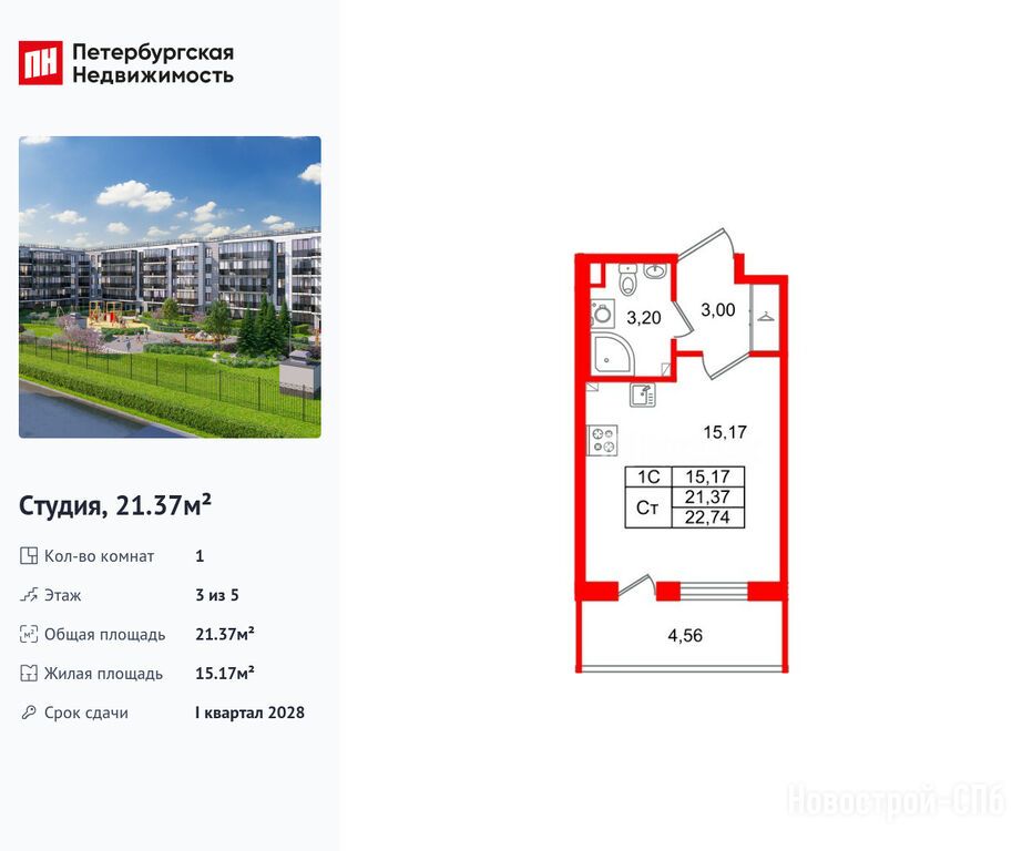 Продается студия в новостройке ЖК «Парадный ансамбль» по адресу Санкт-Петербург, Московский, Пулковское шоссе 103Х. Общая площадь квартиры - 21.37 кв. м. Тип проекта, по которому построен дом — Монолитно-кирпичный, компания-застройщик — Setl Group (Сэтл Групп). Стоимость квартиры — 5 450 077 руб. Способы оплаты можно уточнить у продавца. Срок сдачи — 1 квартал 2028. Более подробная информация по телефону.