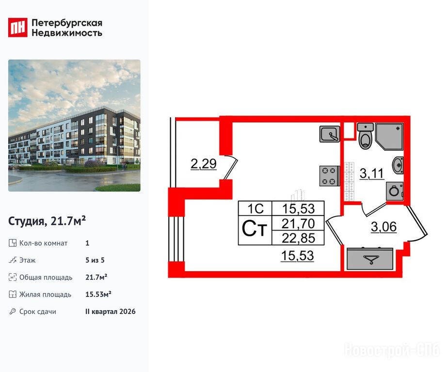 Продается студия в новостройке ЖК «Парадный ансамбль» по адресу Санкт-Петербург, Московский, Пулковское шоссе, участок 29, корпус 6.6. Общая площадь квартиры - 21.7 кв. м. Тип проекта, по которому построен дом — Монолитно-кирпичный, компания-застройщик — Setl Group (Сэтл Групп). Стоимость квартиры — 5 150 102 руб. Способы оплаты можно уточнить у продавца. Срок сдачи — 2 квартал 2026. Более подробная информация по телефону.
