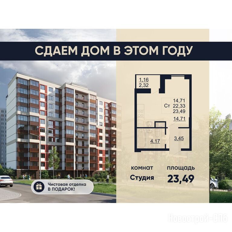 Продается студия в новостройке ЖК «Рубеж» по адресу Ленинградская область, Всеволожский район, Поселок им. Свердлова, Западный проезд, стр.уч. 12. Общая площадь квартиры - 22.8 кв. м. Тип проекта, по которому построен дом — Монолитно-кирпичный, компания-застройщик — ГК «Стоун», СЗ Альтернатива. Стоимость квартиры — 4 149 000 руб. Способы оплаты можно уточнить у продавца. Более подробная информация по телефону.