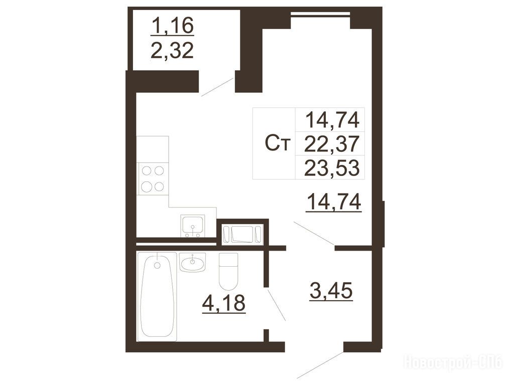 студия, 23.53 м2, 2 этаж