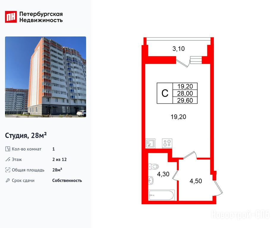 студия, 28.00 м2, 2 этаж