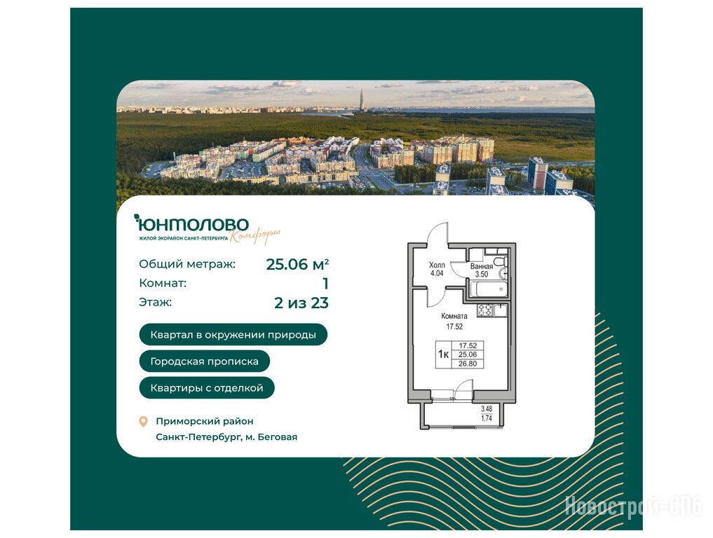 Продается студия в новостройке ЖК «Юнтолово» по адресу Санкт-Петербург, Приморский, Ивинская улица, 5к2. Общая площадь квартиры - 26.8 кв. м. Тип проекта, по которому построен дом — Монолитно-кирпичный, компания-застройщик — «Главстрой Санкт-Петербург». Стоимость квартиры — 7 269 768 руб. Способы оплаты можно уточнить у продавца. Срок сдачи — 1 квартал 2026. Более подробная информация по телефону.