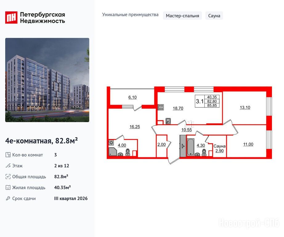 Продается трехкомнатная квартира в новостройке ЖК «Бионика Заповедная» по адресу Санкт-Петербург, Приморский, Суздальское шоссе, ЖК «Бионика Заповедная», корпус 1.2. Общая площадь квартиры - 82.8 кв. м. Тип проекта, по которому построен дом — Монолит, компания-застройщик — Setl Group (Сэтл Групп), ООО СЗ СЭТЛ РАЗВИТИЕ. Стоимость квартиры — 21 500 457 руб. Способы оплаты можно уточнить у продавца. Срок сдачи — 3 квартал 2026. Более подробная информация по телефону.