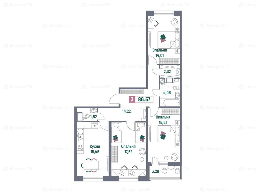 Продается трехкомнатная квартира в новостройке ЖК «Фотограф» по адресу Ленинградская область, Всеволожский район, Мурино, Ручьевский пр-т, д. 1/24, корпус 2. Общая площадь квартиры - 86.57 кв. м. Тип проекта, по которому построен дом — Монолитно-кирпичный, компания-застройщик — Инвестиционно-строительная группа «МАВИС». Стоимость квартиры — 14 587 045 руб. Способы оплаты можно уточнить у продавца. Срок сдачи — 4 квартал 2025. Более подробная информация по телефону.